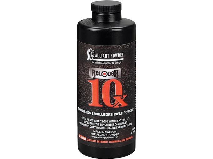 Reloder 10x is newest Alliant powder designed for use in light varmint loads, this smokeless powder creates high velocities also making it an excellent choice for benchrest shooters. Reloder 10x is one of the best choices for light bullet applications in .222 Rem, .223 Rem .22-250 Rem and key bench rest calibers. Also great in light bullet .308 Win loads.