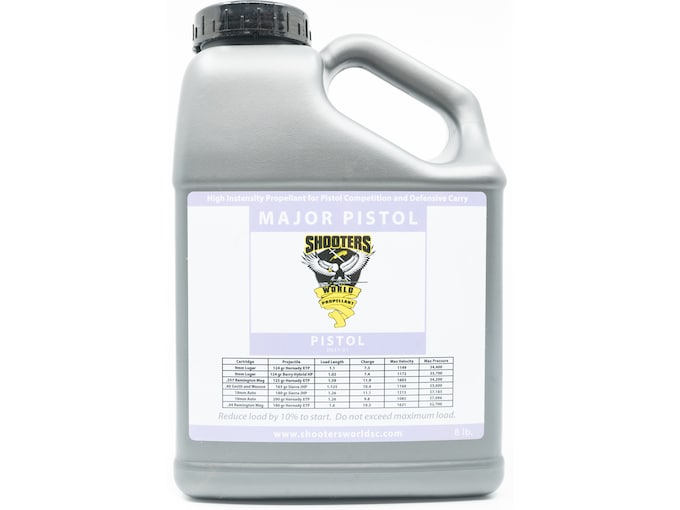 This propellant is a canister form of Lovex D037.1 reloading propellant. It is similar in burn speed to ACCURATE No. 7, 2400 and Blue Dot. The gas generation rate is appropriate for cartridges of the 9mm and 10mm Auto, .357 SIG, .45 Colt, .410 Shot shell, light-bullet magnum pistol loads, and other high intensity pistol cartridges. It is especially good for short barrel magnum revolvers, where complete combustion, high velocity and low muzzle flash are desired. It is also possible to achieve extremely high velocities in 9mm Luger with Major Pistol. A spherical propellant, Major Pistol meters through charge plates consistently and will work with high-speed loaders with very good flow. It does contain a level of flash suppressant.Warning About Smokeless Powder: Do not exceed the loads displayed in the reloaders guideNever mix any two powders regardless of type, brand, or source Never substitute any smokeless powder for Black Powder or any Black Powder substitute